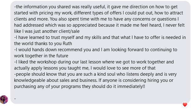 Hello there! I'm Ruth. As a CEO who's touched the seven-figure mark, my mission is to guide soulful entrepreneurs through the art of genuine sales conversations.